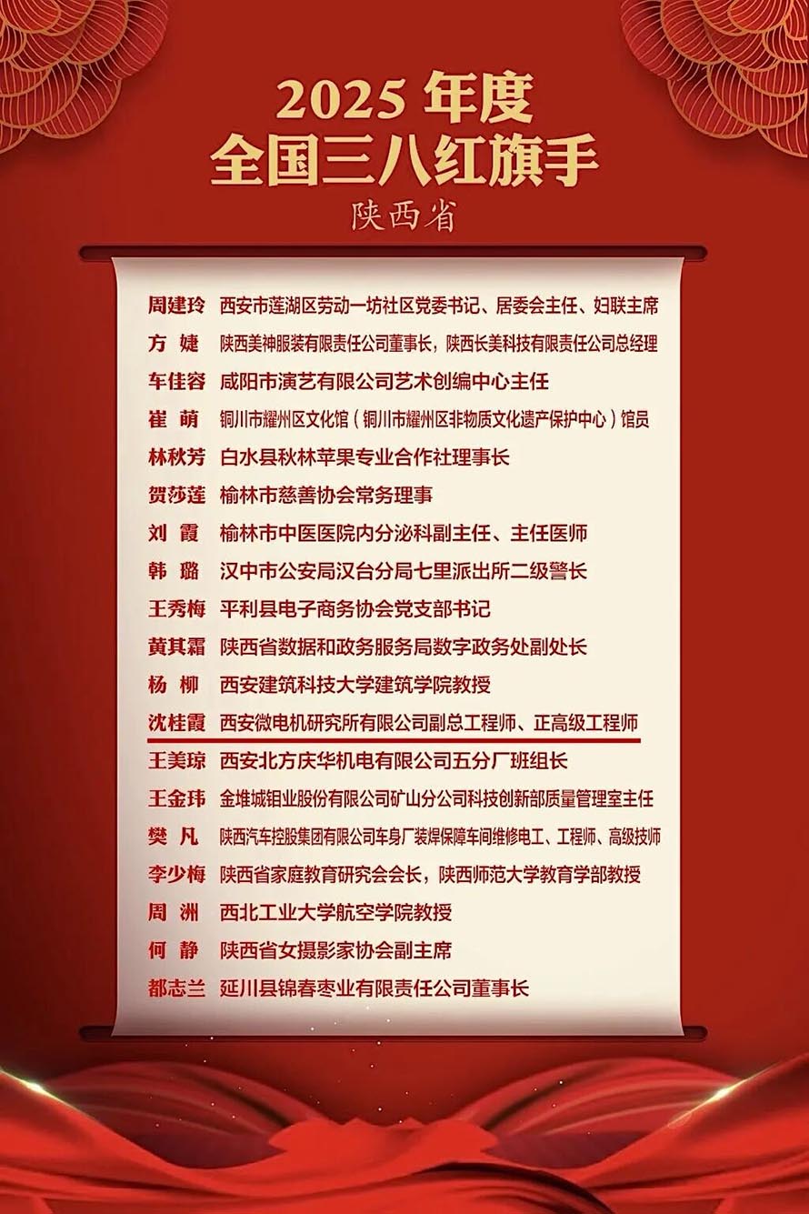 我公司副总工程师沈桂霞同志荣获“2025年度全国三八红旗手”称号。这是沈桂霞副总工的个人荣誉,更是西微所的集体荣誉!